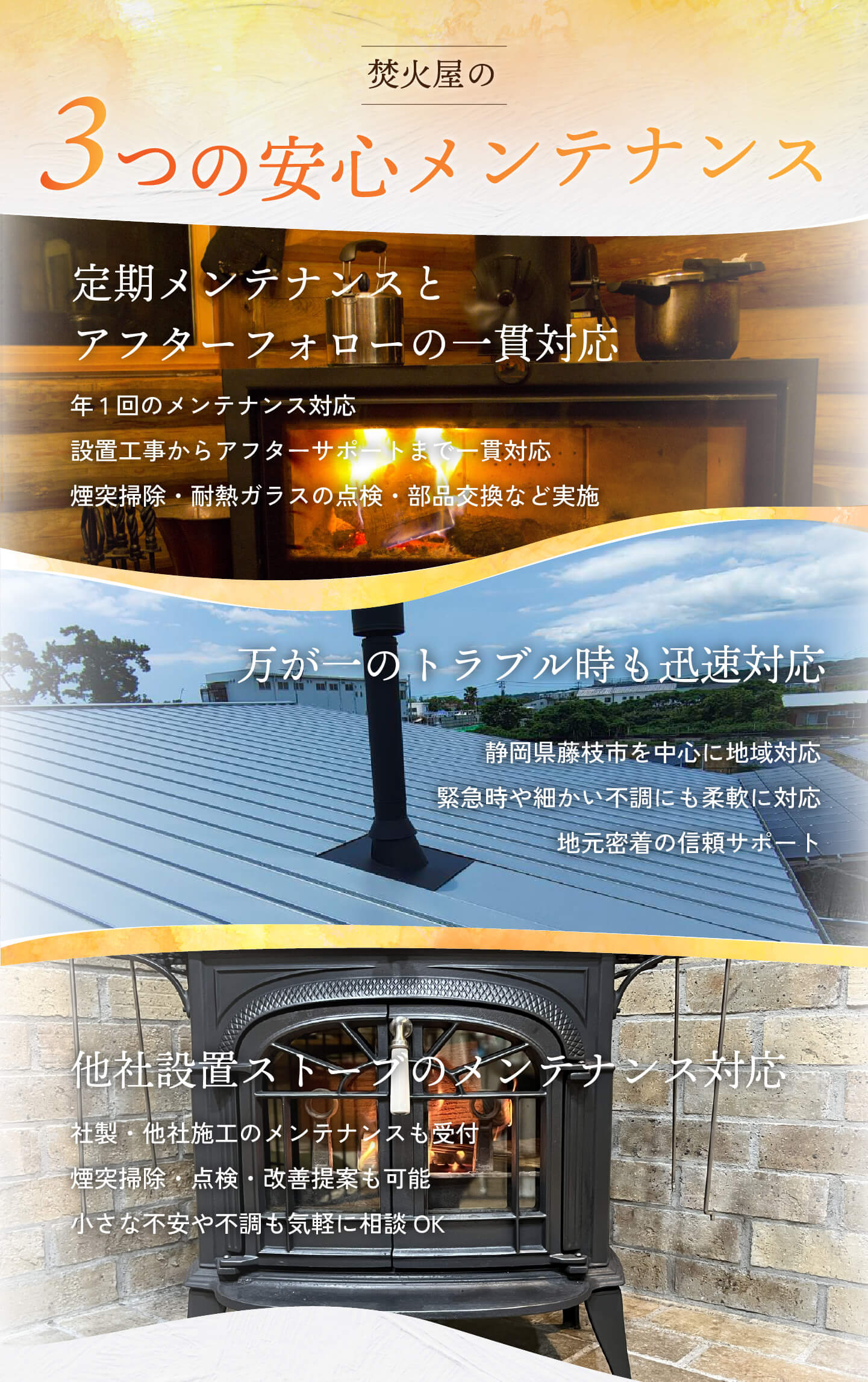 事業内容 薪ストーブ本体および関連機器の販売 / 薪ストーブの設置工事・煙突工事 / 定期メンテナンス・修理対応