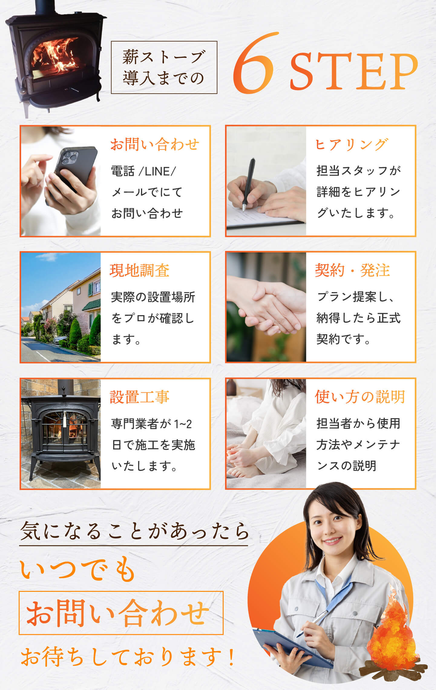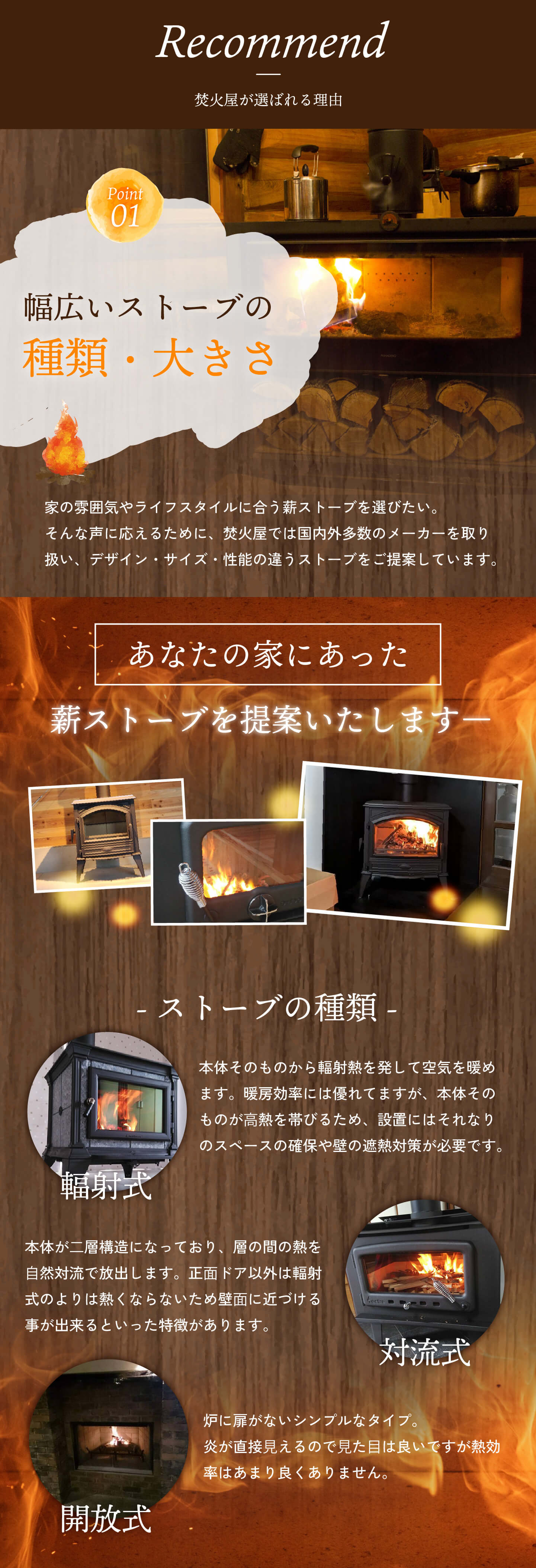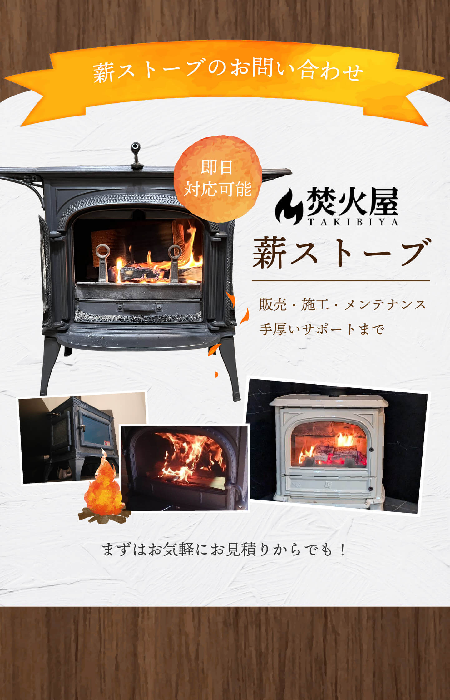事業内容 薪ストーブ本体および関連機器の販売 / 薪ストーブの設置工事・煙突工事 / 定期メンテナンス・修理対応