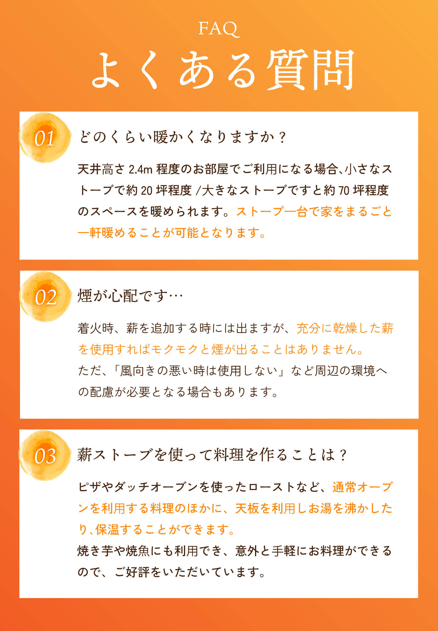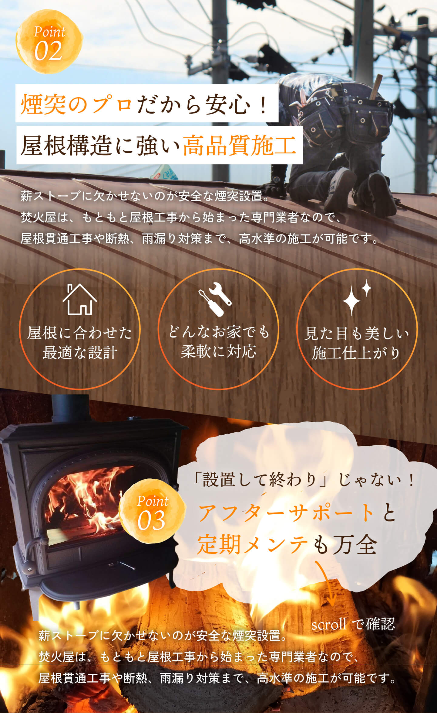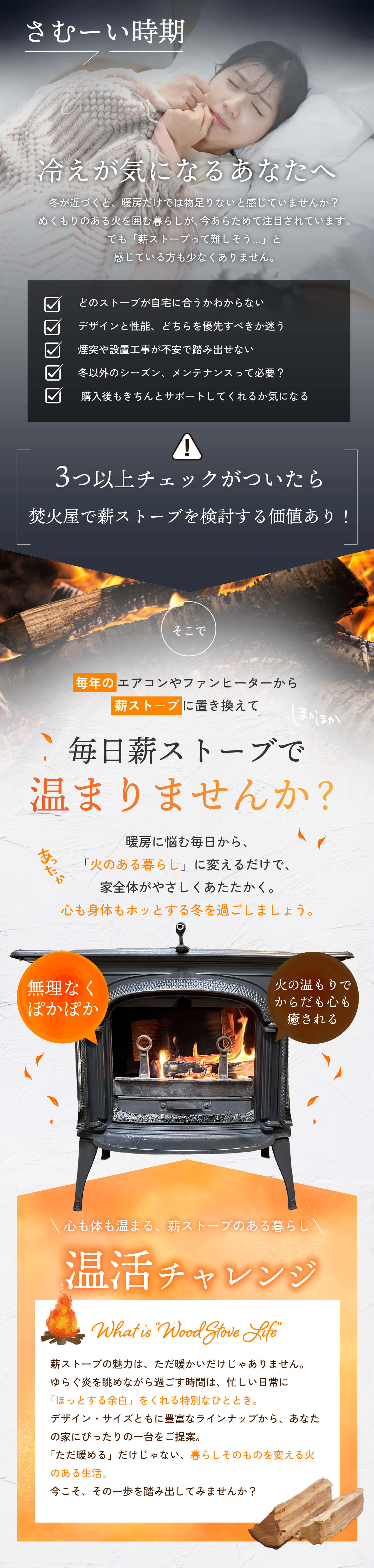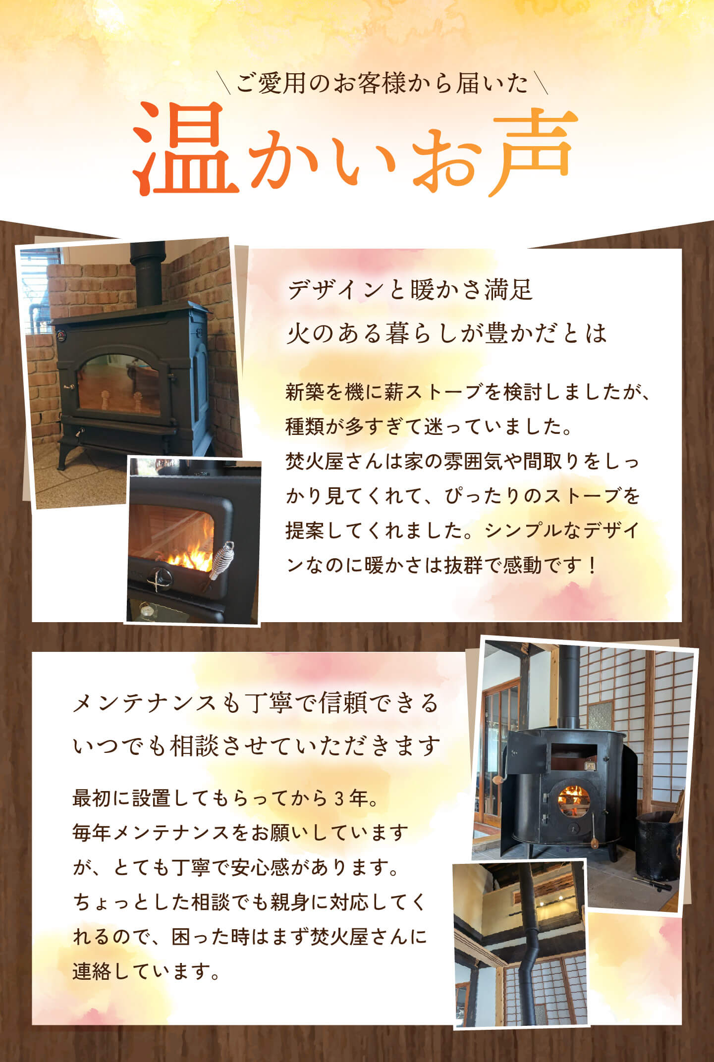 事業内容 薪ストーブ本体および関連機器の販売 / 薪ストーブの設置工事・煙突工事 / 定期メンテナンス・修理対応